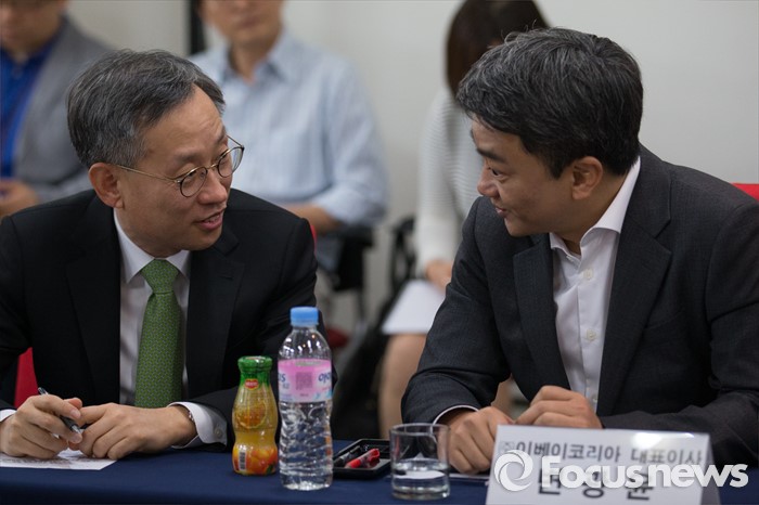 (서울=포커스뉴스) 김상헌(왼쪽) 네이버 대표이사 사장과 변광윤 이베이코리아 사장이 19일 오후 서울 강남구 위메프 본사에서 열린 '전자상거래 업계대표 간담회'에 참석해 대화를 나누고 있다.