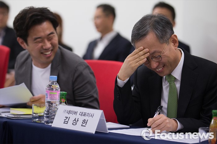 (서울=포커스뉴스) 임지훈(왼쪽) 카카오 대표이사와 김상헌 네이버 대표이사 사장이 19일 오후 서울 강남구 위메프 본사에서 열린 '전자상거래 업계대표 간담회'에 참석해 환한 웃음을 짓고 있다.
