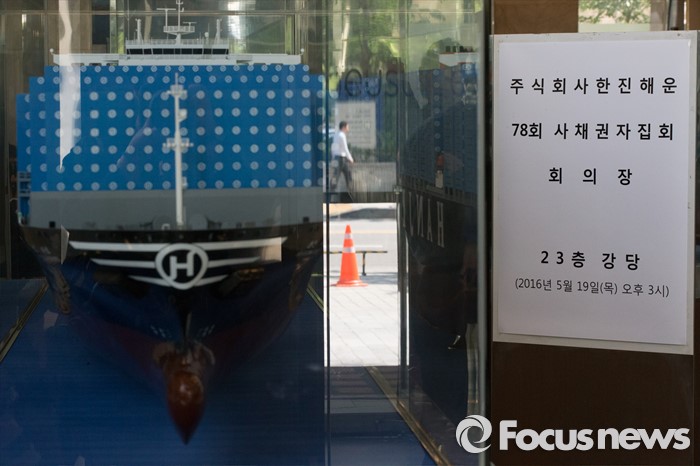 (서울=포커스뉴스) 한진해운의 채무조정을 위한 첫 사채권자 집회가 열린 19일 오후 서울 영등포구 한진해운 본사 로비에 선박모형과 안내문이 보이고 있다.