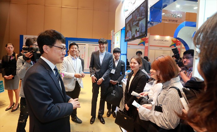 (서울=포커스뉴스) 고영선 고용노동부 차관이 19일 서울 삼성동 코엑스에서 열린 글로벌 취업상담회에 참석, 취업상담회 각 부스를 돌아보며 해외취업희망 청년들과 기업관계자들의 애로사항을 청휘하며 격려하고 있다. <사진제공=고용노동부>