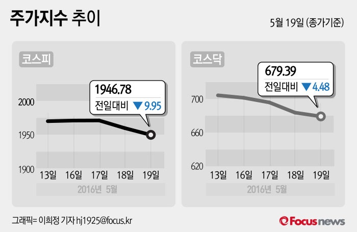 (서울=포커스뉴스) 18일 코스피지수는 전날 보다 0.51%(9.95포인트) 내린 1946.78에 장을 마쳤다. 코스닥지수는 전일 대비 0.66%(4.48포인트) 내린 679.39에 마감했다.