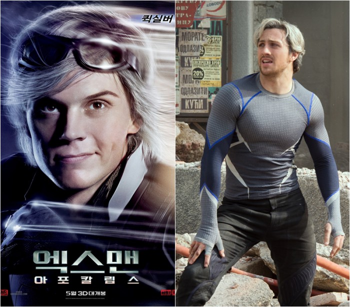 두 영화 속 퀵실버는 동일한 능력을 소유하고 있지만 탄생 배경이 조금 다르다. '어벤져스: 에이지 오브 울트론' 속 퀵실버는 스칼렛 위치(엘리자베스 올슨 분)와 쌍둥이 남매로 등장한다. '엑스맨: 아포칼립스' 속 퀵실버는 방에 틀어박혀 지내며 엄마 품을 벗어나지 않는 소년의 모습이다.