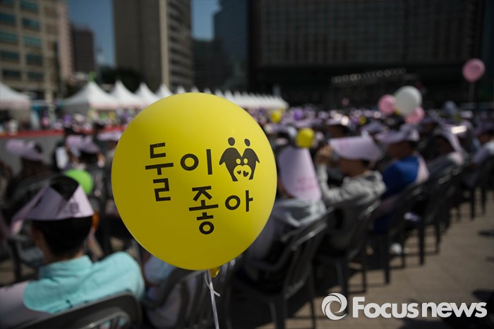 (서울=포커스뉴스) 19일 오후 서울시청광장에서 열린 '제1회 건강가정 다출산 범국민대회'에 다출산을 장려하는 풍선이 매달려있다.