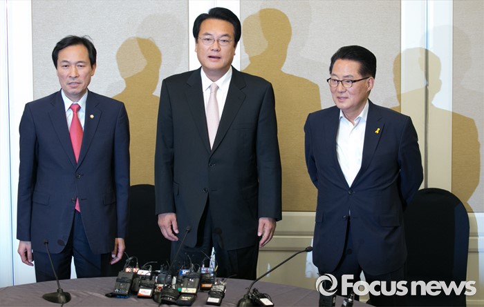 (서울=포커스뉴스) 19일 오후 서울 여의도 국회 귀빈식당에서 20대 국회 원구성 등 협상을 위해 열린 3당 원내대표 회동에 참석한 의원들이 취재진을 향해 포즈를 취하고 있다. 왼쪽부터 우상호 더불어민주당 원내대표, 정진석 새누리당 원내대표, 박지원 국민의당 원내대표.