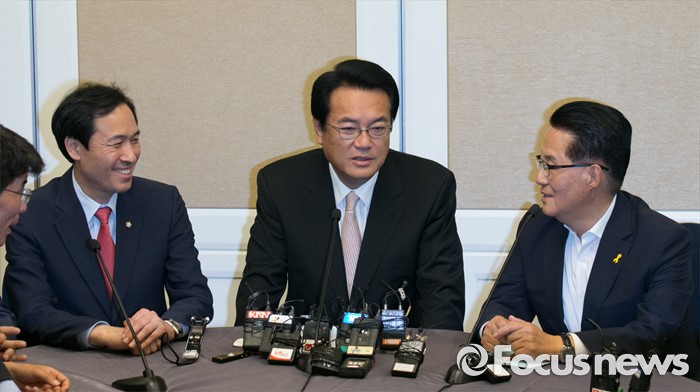 (서울=포커스뉴스) 19일 오후 서울 여의도 국회 귀빈식당에서 20대 국회 원구성 등 협상을 위해 열린 3당 원내대표 회동에 참석한 정진석(가운데) 새누리당 원내대표, 우상호(가운데) 더불어민주당 원내대표, 박지원 국민의당 원내대표가 대화하고 있다.
