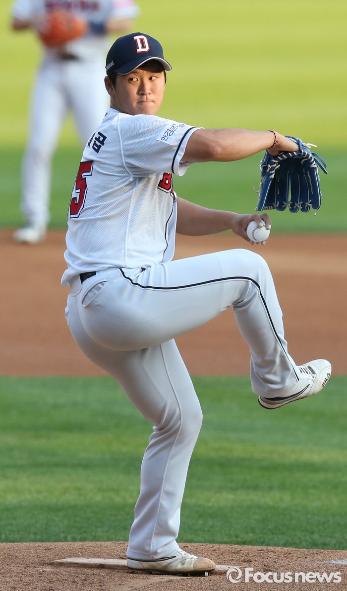(서울=포커스뉴스) 19일 서울 잠실구장에서 열린 2016프로야구 KIA-두산 경기에서 1회초 두산 선발투수 진야곱이 투구하고 있다.