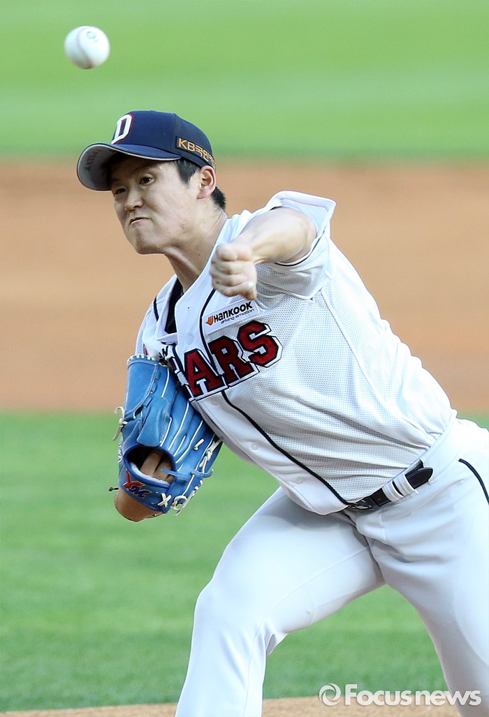 (서울=포커스뉴스) 19일 서울 잠실구장에서 열린 2016프로야구 KIA-두산 경기에서 1회초 두산 선발투수 진야곱이 투구하고 있다.