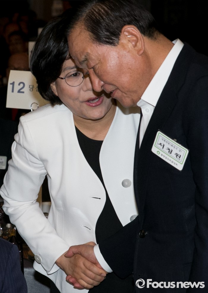 (서울=포커스뉴스) 19일 오후 여의도 서울시티클럽에서 열린 충청 향우 친선의 밤 행사에 참석한 서청원(오른쪽) 새누리당 전 최고위원과 이혜훈 비대위원이 대화하고 있다.