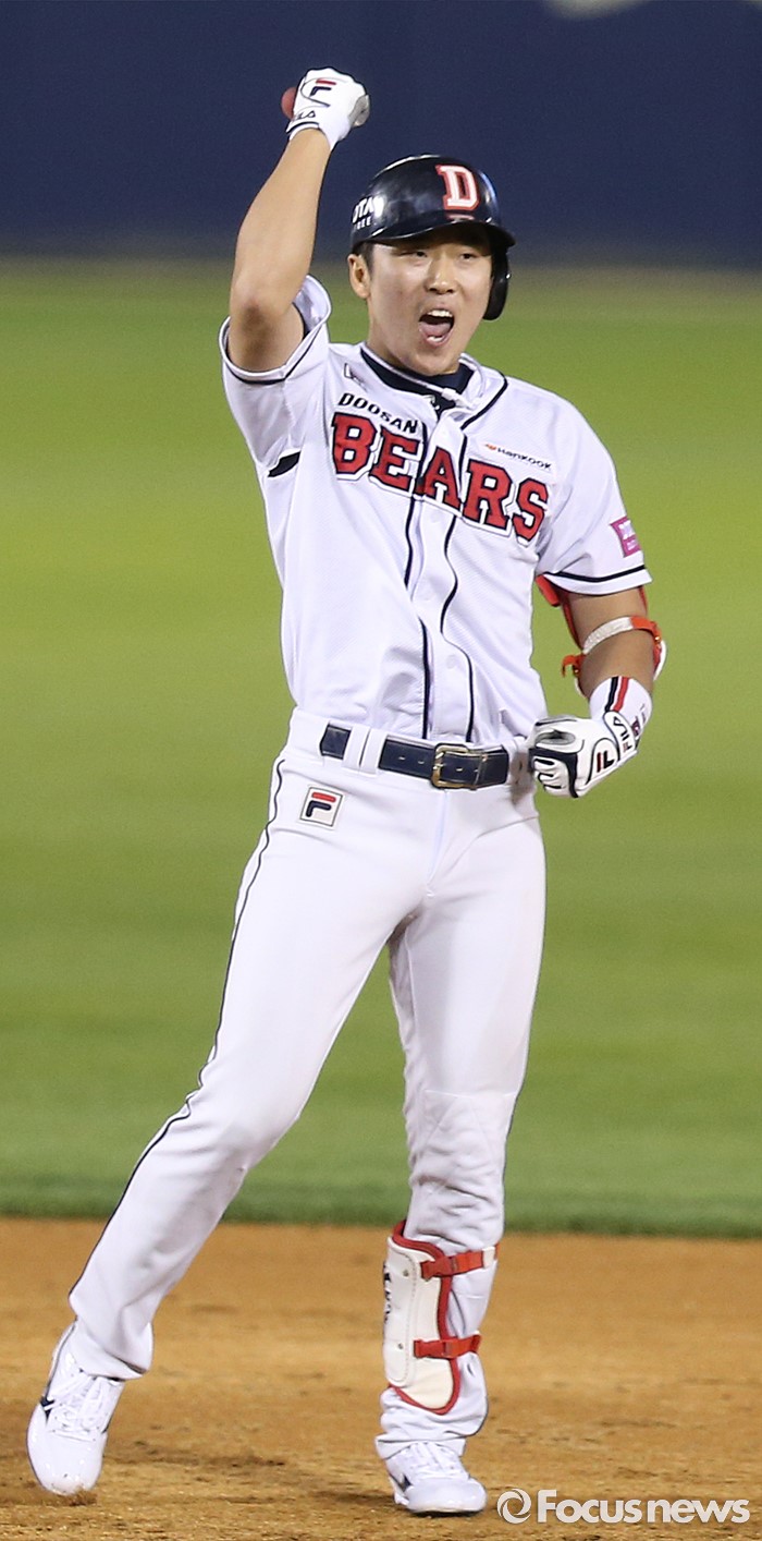 (서울=포커스뉴스) 19일 서울 잠실구장에서 열린 2016프로야구 KIA-두산 경기 4회말 1사 2루에서 좌익수 왼쪽으로 빠지는 2루타로 역전 주자를 불러들인 두산 허경민이 어퍼컷 세리머니로 환호하고 있다.