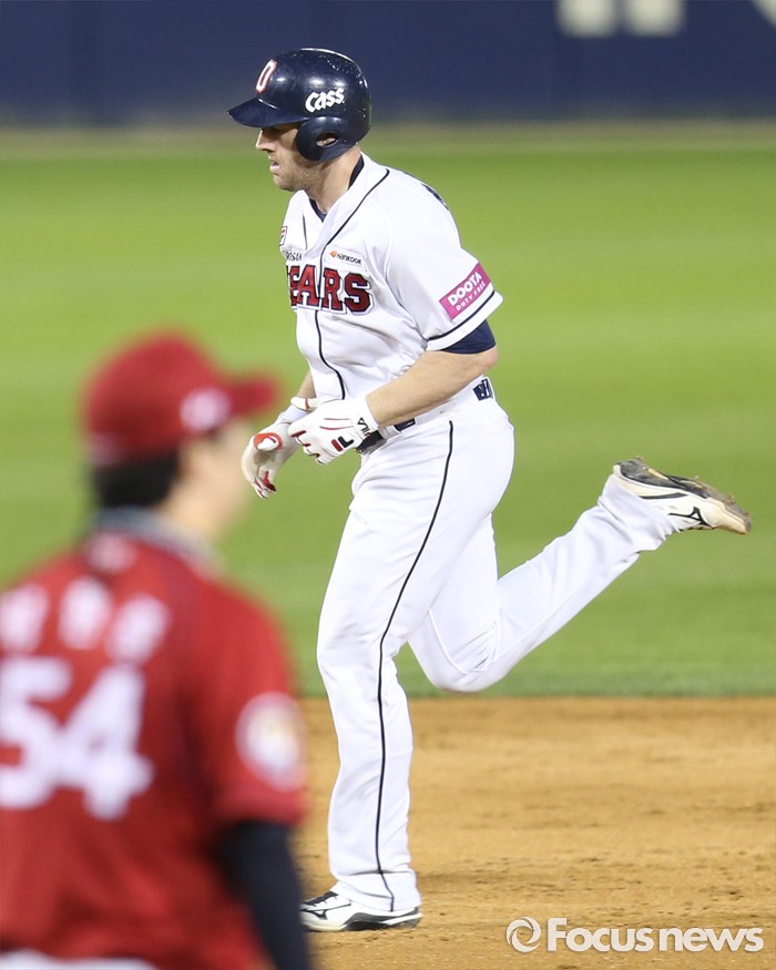 (서울=포커스뉴스) 19일 서울 잠실구장에서 열린 2016프로야구 KIA-두산 경기 5회말 2사 1루에서 두산 에반스가 좌월 2점 홈런을 치고 그라운드를 돌고 있다.