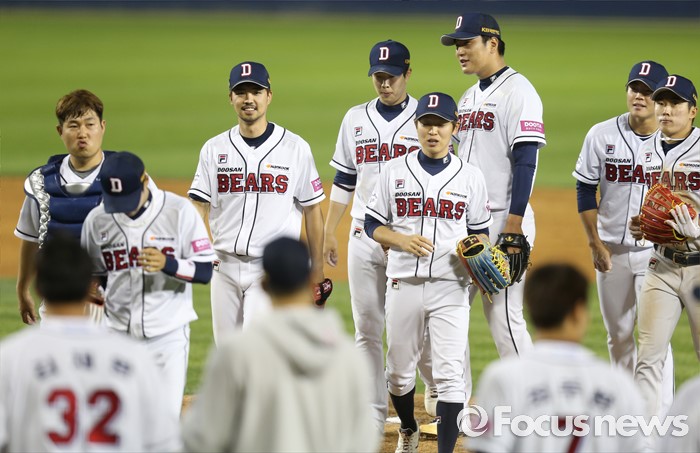 (서울=포커스뉴스) 19일 서울 잠실구장에서 열린 2016프로야구 KIA-두산 경기에서 KIA와의 3연전을 싹쓸이한 두산 선수들이 밝은 표정으로 덕아웃으로 향하고 있다.
