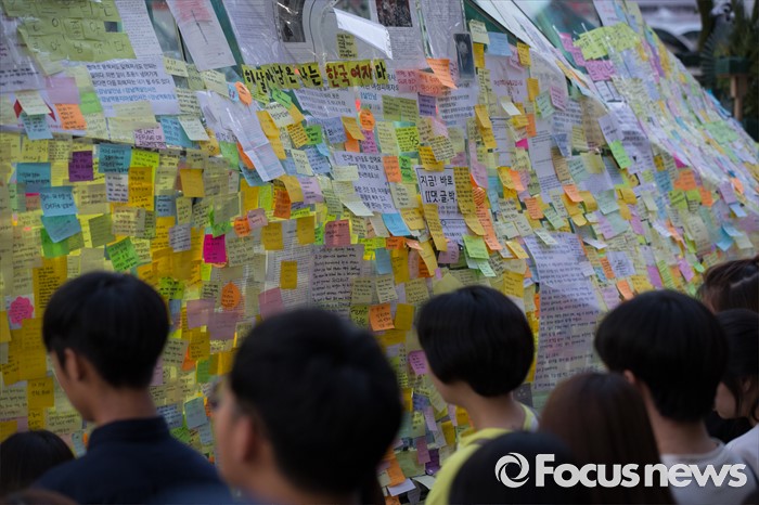 (서울=포커스뉴스) 19일 오후 서울 서초구 강남역 10번출구에서 시민들이 '강남 묻지마 살인' 피해자를 추모하고 있다.