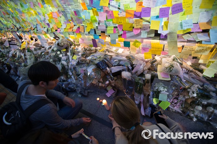 (서울=포커스뉴스) 19일 오후 서울 서초구 강남역 10번출구에서 시민들이 '강남 묻지마 살인' 피해자를 추모하고 있다.