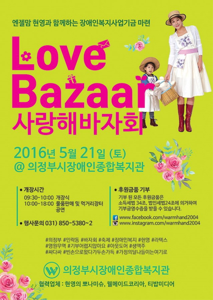 지난해에 이어 ‘사랑해 바자회’에 참여하는 현영은 “재능기부에서 물품 기부에 이르기까지 많은 분이 이번 행사를 위해 적극적으로 도움을 주셨다”며 “빈손으로 왔다가 두손 가득 돌아가셔서 나눔과 사랑을 되새겨 보는 기회가 되새길 바란다”고 행사를 앞둔 소감을 밝혔다.방송인 현영이 함께하는 ‘제11회 사랑해(海) 바자회’가 오는 21일 오전 의정부시장애인종합복지관에서 열린다. 사진은 행사 포스터. <사진제공=의정부장애인종합복지관>