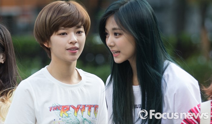 (서울=포커스뉴스) 20일 오전 서울 영등포구 KBS에서 걸그룹 트와이스의 멤버 정연(왼쪽)과 쯔위가 생방송 뮤직뱅크 리허설에 참여하기 위해 이동하던중 대화를 나누고 있다.