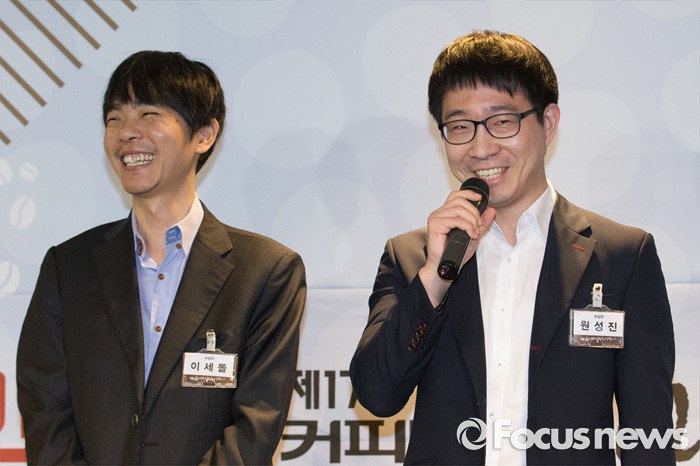 (서울=포커스뉴스) 이세돌(왼쪽) 9단과 원성진 9단이 20일 오전 서울 종로구 플라자호텔에서 열린 한국기원 맥심커피배 시상식에 참석해 미소 짓고 있다.