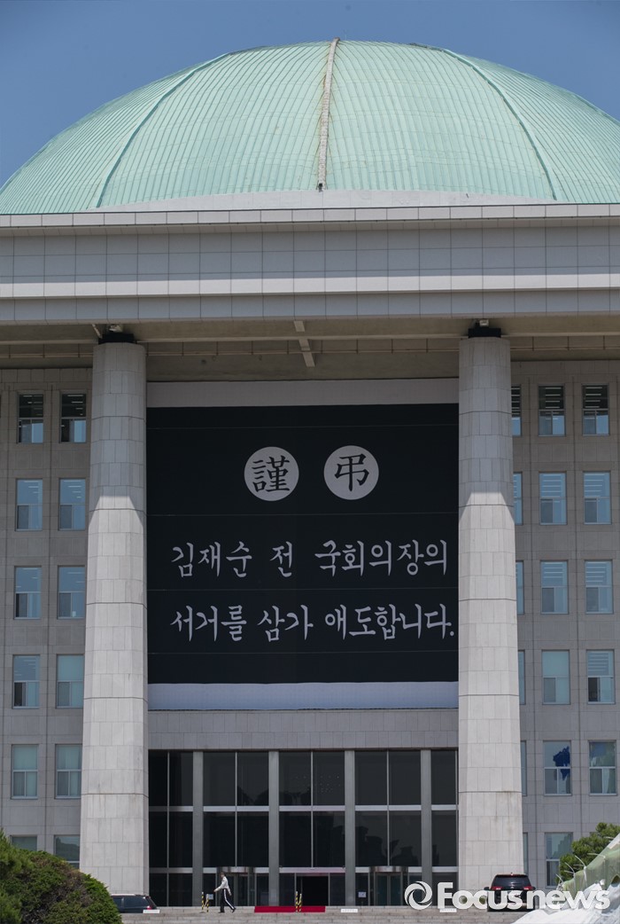 (서울=포커스뉴스) 20일 오전 서울 여의도 국회 본청에 지난 17일 별세한 김재순 전 국회의장을 추모하는 현수막이 걸려 있다.