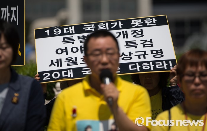 (서울=포커스뉴스) 4.16연대가 20일 오전 서울 여의도 국회 앞에서 19대 국회 세월호 특별법 개정 특검 무산에 대한 입장발표 기자회견 갖고 있다.