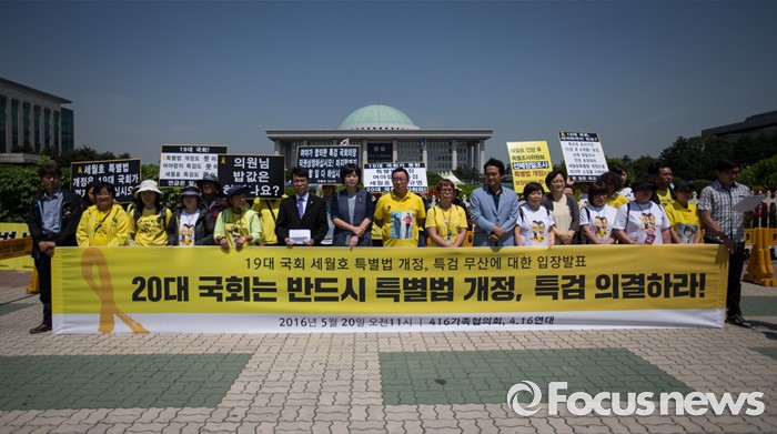 (서울=포커스뉴스) 4.16연대가 20일 오전 서울 여의도 국회 앞에서 19대 국회 세월호 특별법 개정 특검 무산에 대한 입장발표 기자회견 갖고 있다.