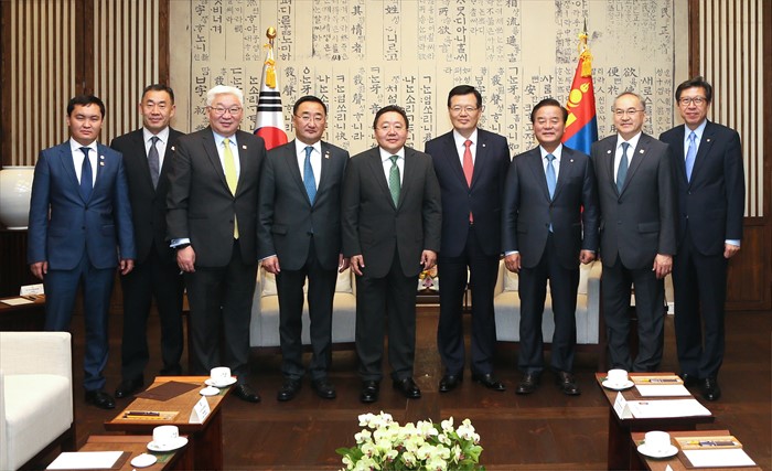 (서울=포커스뉴스) 정의화(오른쪽 네번째) 국회의장 등이 20일 오전 서울 여의도 국회 의장접견실에서 차히아 엘벡도르지(ELBEGDORJ Tsakhia, 왼쪽 다섯번째) 몽골 대통령 일행을 만나 양국간 우호 협력관계 증진 방안에 대해 논의한 뒤 기념촬영을 하고 있다. <사진제공=국회>