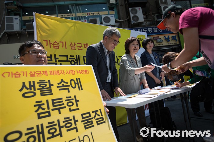 (서울=포커스뉴스) 심상정(왼쪽 세번째) 정의당 대표와 가습기 살균제 피해자들이 20일 오전 서울 여의도역 사거리 앞에서 가습기 살균제 참사 관련 대국민 캠페인을 하고 있다.