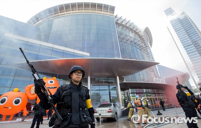 (서울=포커스뉴스) 20일 오후 서울 강남구 코엑스에서 열린 '2016 재난대응 안전한국훈련'에 참여한 훈련병력들이 테러대응훈련을 펼치고 있다.