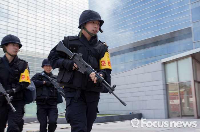 (서울=포커스뉴스) 20일 오후 서울 강남구 코엑스에서 열린 '2016 재난대응 안전한국훈련'에 참여한 훈련병력들이 테러대응훈련을 펼치고 있다.