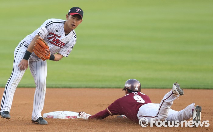 (서울=포커스뉴스) 20일 서울 잠실구장에서 열린 2016 프로야구 넥센-LG 경기 1회초 2사 1루에서 넥센 1루주자 박정음이 김민성 타석에서 2루 도루를 하고 있다.