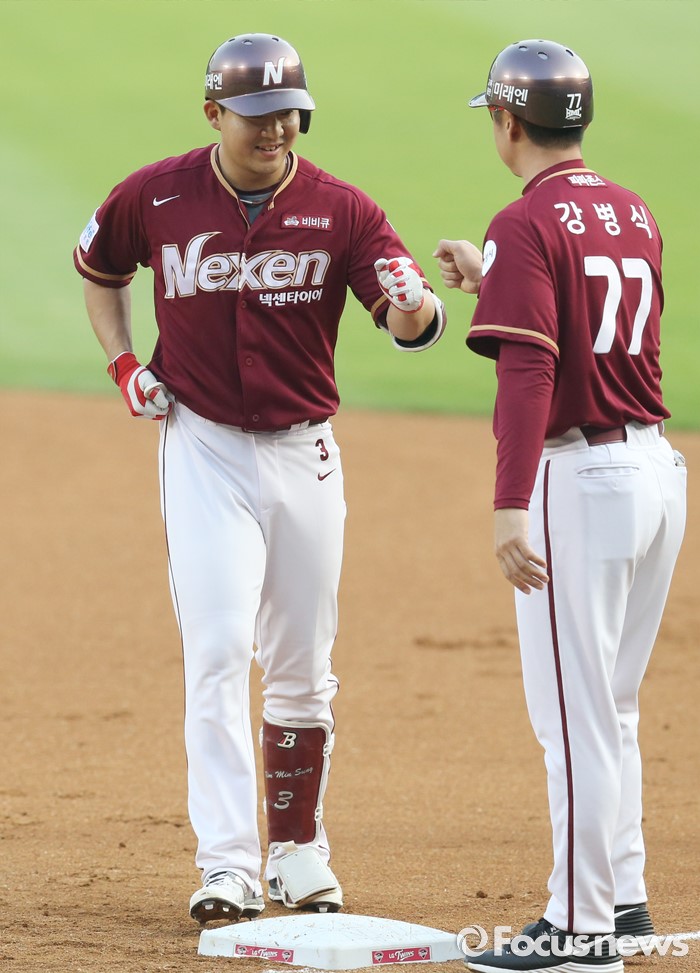 (서울=포커스뉴스) 20일 서울 잠실구장에서 열린 2016 프로야구 넥센-LG 경기 1회초 2사 2루에서 넥센 김민성이 1타점 우전 안타를 치고 강병식 코치와 주먹을 마주치고 있다.