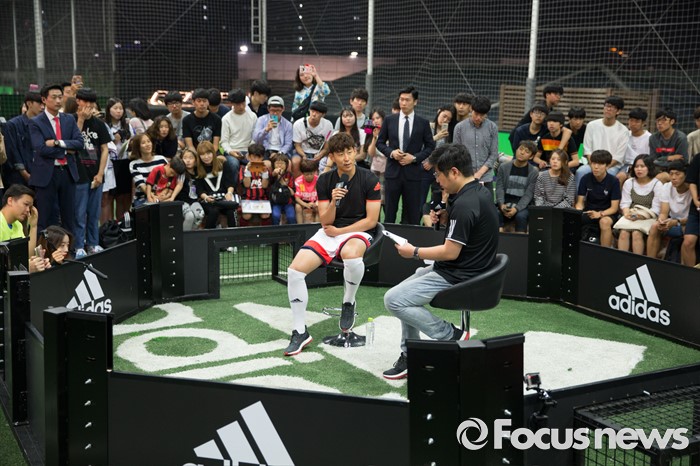 (서울=포커스뉴스) 손흥민이 20일 오후 서울 용산구 아이파크몰 풋살경기장에서 열린 아디다스 손흥민 팬미팅 및 사인회에서 팬들과 근황토크를 하고 있다.