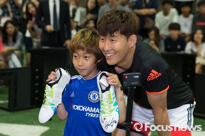 (서울=포커스뉴스) 손흥민이 20일 오후 서울 용산구 아이파크몰 풋살경기장에서 열린 아디다스 손흥민 팬미팅 및 사인회에서 팬과 함께 기념촬영을 하고 있다.