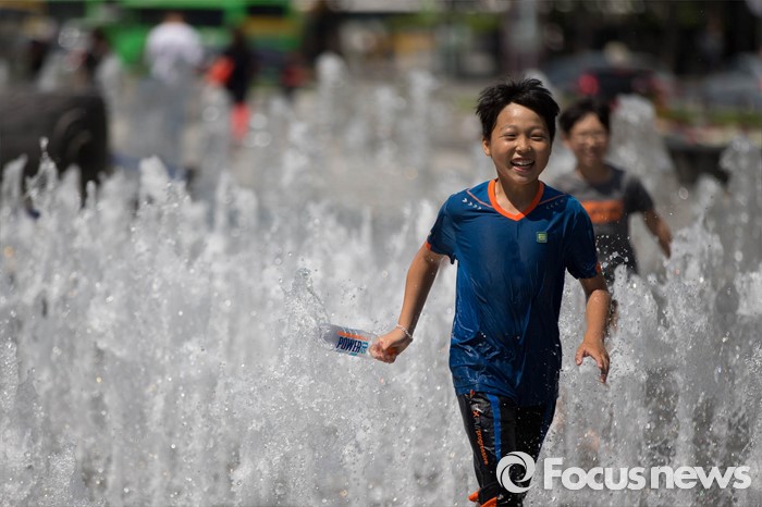 바다의 물결은 전해상에서 0.5~2.5m로 일겠다.(서울=포커스뉴스) 서울의 낮 기온이 30도를 넘는 19일 오후 서울 광화문광장 분수대에서 아이들이 물놀이를 즐기고 있다. 2016.05.19 이승배 기자