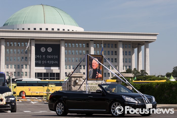 (서울=포커스뉴스) 21일 오전 서울 여의도 국회에서 엄수된 故 김재순 전 국회의장 국회장 영결식을 마친 뒤 운구행렬이 국회를 떠나고 있다.