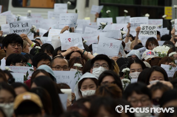 (서울=포커스뉴스) 21일 오후 서울 서초구 강남역 10번 출구 인근에서 시민들이 '강남역 여성혐오 살인사건 추모 집회'에 참석해 행진을 마친 뒤 피켓을 들고 있다.