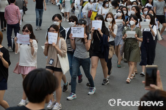 (서울=포커스뉴스) 21일 오후 서울 서초구 강남역 10번 출구 인근에서 시민들이 '강남역 여성혐오 살인사건 추모 집회'에 참석해 행진하고 있다.