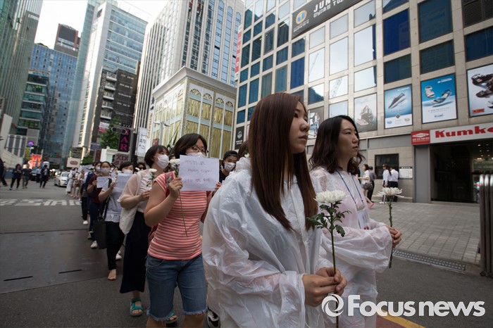 (서울=포커스뉴스) 21일 오후 서울 서초구 강남역 10번 출구 인근에서 시민들이 '강남역 여성혐오 살인사건 추모 집회'에 참석해 행진하고 있다.