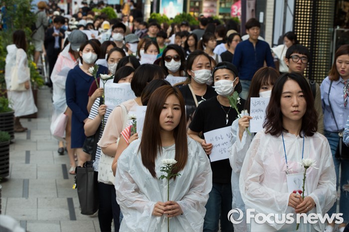 (서울=포커스뉴스) 21일 오후 서울 서초구 강남역 10번 출구 인근에서 시민들이 '강남역 여성혐오 살인사건 추모 집회'에 참석해 행진하고 있다.