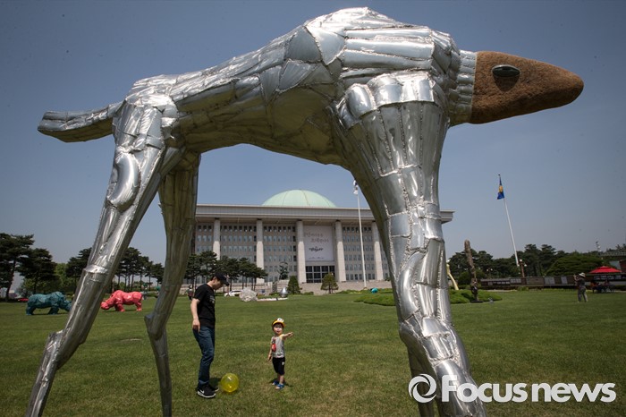 (서울=포커스뉴스) 22일 오전 서울 여의도 국회 잔디마당에서 열린 '2016 열린국회마당' 축제에서 행사에 참석한 한 가족들이 잔디밭에 놓인 대형 전시물 사이를 걷고 있다.