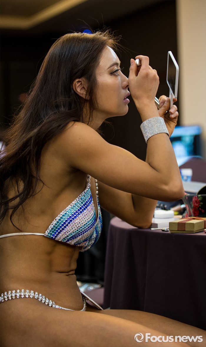 (서울=포커스뉴스) 22일 오전 서울 서초구 더케이호텔 아트홀에서 열린 피트니스 대회 'WBFF 아시아 챔피언십'에 참가한 선수들이 대기실에서 화장을 고치고 있다.