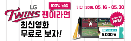 5월말까지 LG트윈스 홈페이지와 앱에서 참여 가능하다. 이벤트에 응모하면 LTE비디오포털 5000원 VOD 쿠폰을 100% 준다. LTE비디오포털은 구글 스토어와 앱스토어 등에서 다운받을 수 있다.프로야구 LG가 LTE비디오포털과 함께 5월말까지 100% 경품행사를 연다. 사진은 LG 구단 홈페이지 베너 이미지. <사진제공=LG 트윈스>