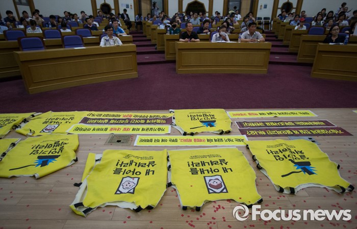 (서울=포커스뉴스) 22일 오후 서울 영등포구 국회의원회관에서 열린 '2016 가습기살균제피해자 및 가족모임 법인창립총회'에 다양한 구호가 적힌 조끼들이 무대 위에 놓여져 있다.