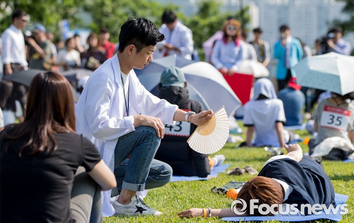 (서울=포커스뉴스) 22일 오후 서울 용산구 이촌 한강공원에서 열린 '한강 멍때리기 대회'에서 참가자들이 관계자의 부채질을 받고 있다.