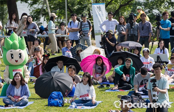 (서울=포커스뉴스) 22일 오후 서울 용산구 이촌 한강공원에서 열린 '한강 멍때리기 대회'에서 참가자들이 멍하게 앉아 있다.