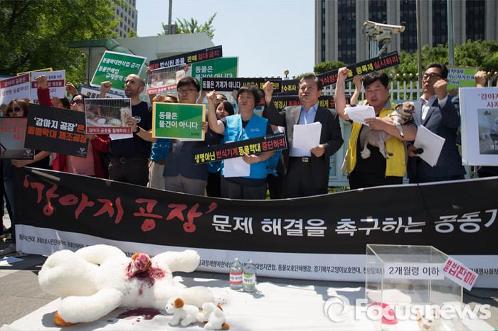 한국동물보호연합 이원복 대표는 “많은 국민이 법개정 움직임에 동참하고 있는 만큼 동물보호법이 진정으로 동물을 보호하는 방향으로 개정되길 기대한다”고 말했다.(서울=포커스뉴스) 19일 오후 서울 종로구 정부서울청사앞에서 동물자유연대 및 시민단체들이 강아지 공장 문제 해결을 촉구하며 구호를 외치고 있다. 2016.05.19 이승배 기자 19일 오후 서울 종로구 정부서울청사앞에서 동물자유연대 및 시민단체들이 강아지 공장 문제 해결을 촉구하며 기자회견을 하고 있다. 실제 '강아지 공장'에서 새끼를 낳던 강아지 신디가 기자회견장에 들어서고 있다. 2016.05.19 이승배 기자 애완견을 잔인하게 학대해 살해한 이란 남성에게 채찍 74대 형벌이 선고됐다. (Photo by Christopher Furlong/Getty Images) 2016.05.18 ⓒ게티이미지/이매진스 19일 오후 서울 종로구 정부서울청사앞에서 동물자유연대 및 시민단체들이 강아지 공장 문제 해결을 촉구하며 퍼포먼스를 하고 있다. 2016.05.19 이승배 기자 19일 오후 서울 종로구 정부서울청사앞에서 동물자유연대 및 시민단체들이 강아지 공장 문제 해결을 촉구하며 기자회견을 하고 있다. 실제 강아지 공장에서 구조된 번식견 신디의 모습. 2016.05.19 이승배 기자