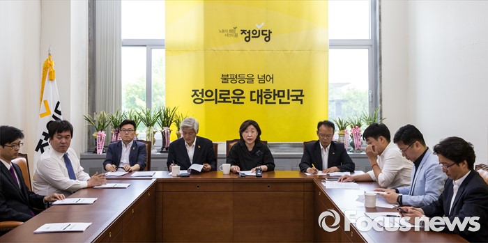 (서울=포커스뉴스) 심상정(왼쪽 다섯 번째) 정의당 상임대표가 23일 오전 서울 여의도 국회에서 열린 상무위원회에 참석해 모두발언 하고 있다.