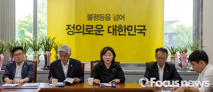 (서울=포커스뉴스) 심상정(왼쪽 세 번째) 정의당 상임대표가 23일 오전 서울 여의도 국회에서 열린 상무위원회에 참석해 모두발언 하고 있다.