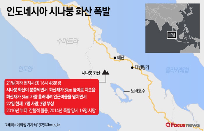(서울=포커스뉴스) 인도네시아 북수마트라주 시나붕 화산 폭발로 22일 현재(현지시간) 7명이 사망했다고 영국 BBC 뉴스 등 외신이 보도했다. 시나붕산은 인도네시아에 있는 활화산 129개 중 하나로, '불의 고리' 환태평양 조산대에 위치해 있다.