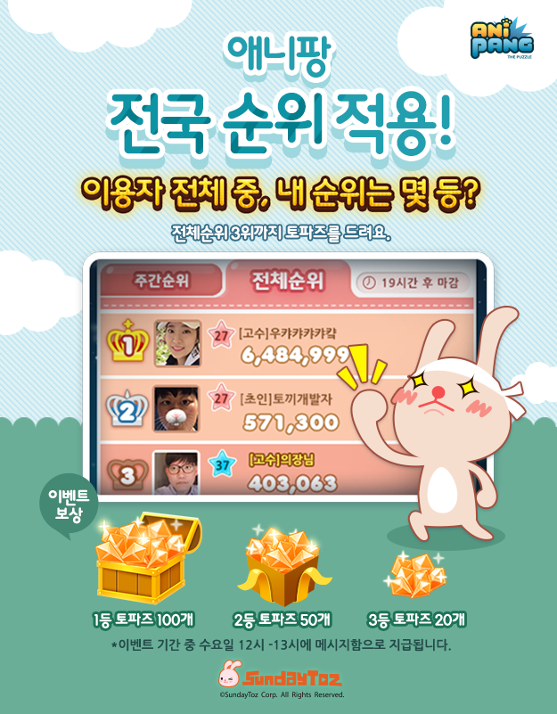 한편 선데이토즈는 이번 업데이트를 기념해 매주 수요일 정오를 기준으로 1~3위를 기록한 이용자들에게 유료 재화인 토파즈를 선물하는 전국 순위 도입 이벤트를 다음 달 1일까지 진행한다.애니팡 전국 순위제 이미지 <사진제공=선데이토즈>
