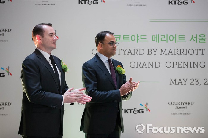 (서울=포커스뉴스) 23일 오전 서울 중구 코트야드 메리어트 서울 남대문 호텔에서 내빈들이 참석한 가운데 개관식이 열리고 있다. 왼쪽부터 폴 캐닝스 코트야드 메리어트 서울 남대문 총지배인, 라지브 메논 메리어트 인터내셔널 최고운영책임자.