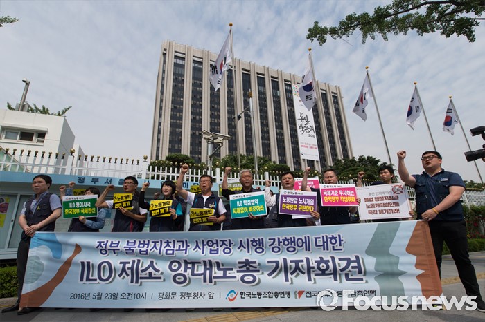 (서울=포커스뉴스) 23일 오전 서울 종로구 정부서울청사 앞에서 열린 한국정부의 불법지침과 사업장 시행 강행에 대한 ILO 제소 양대노총 기자회견에 참석한 양대노총 조합원들이 구호를 외치고 있다.